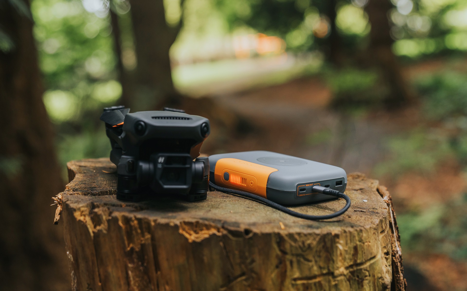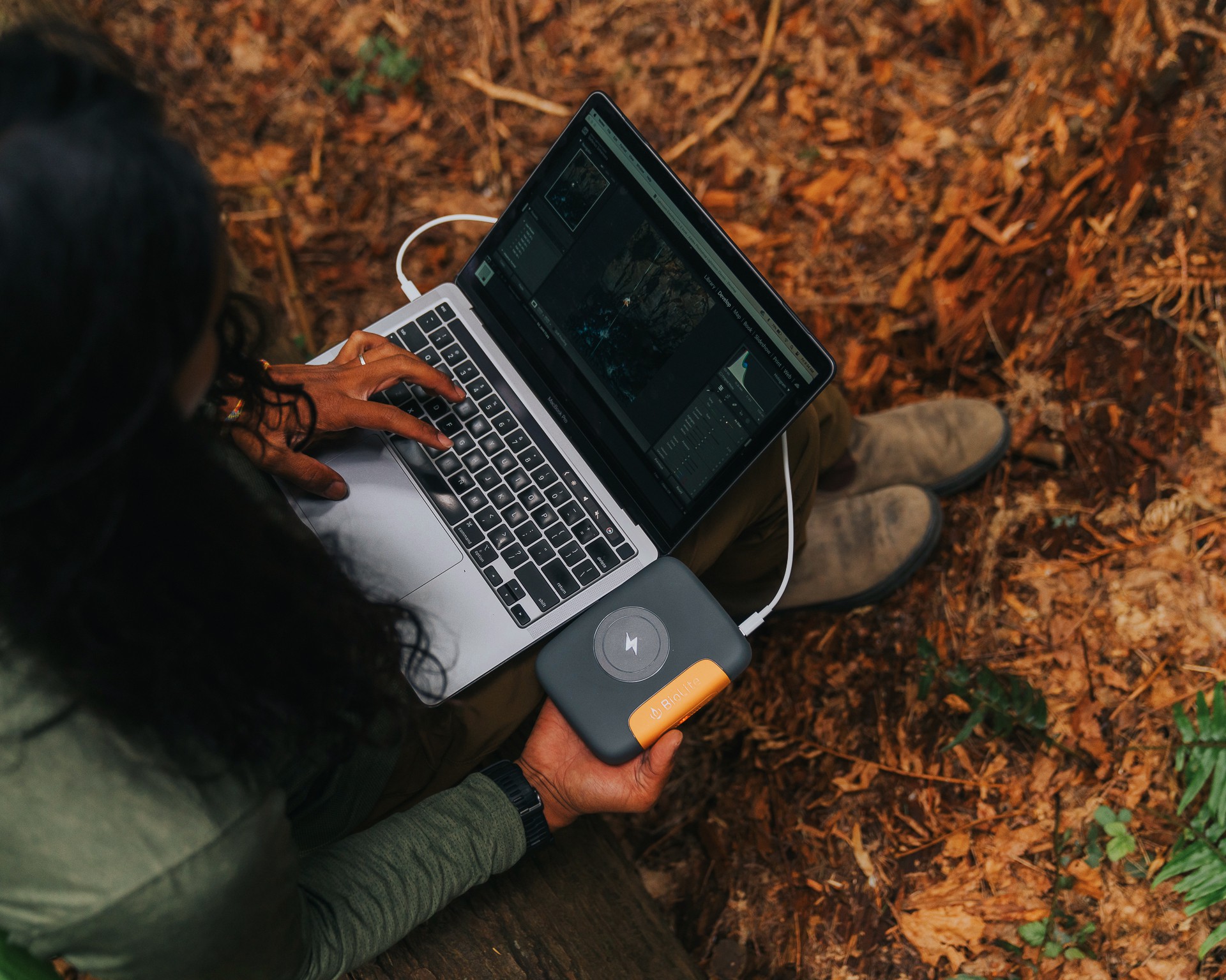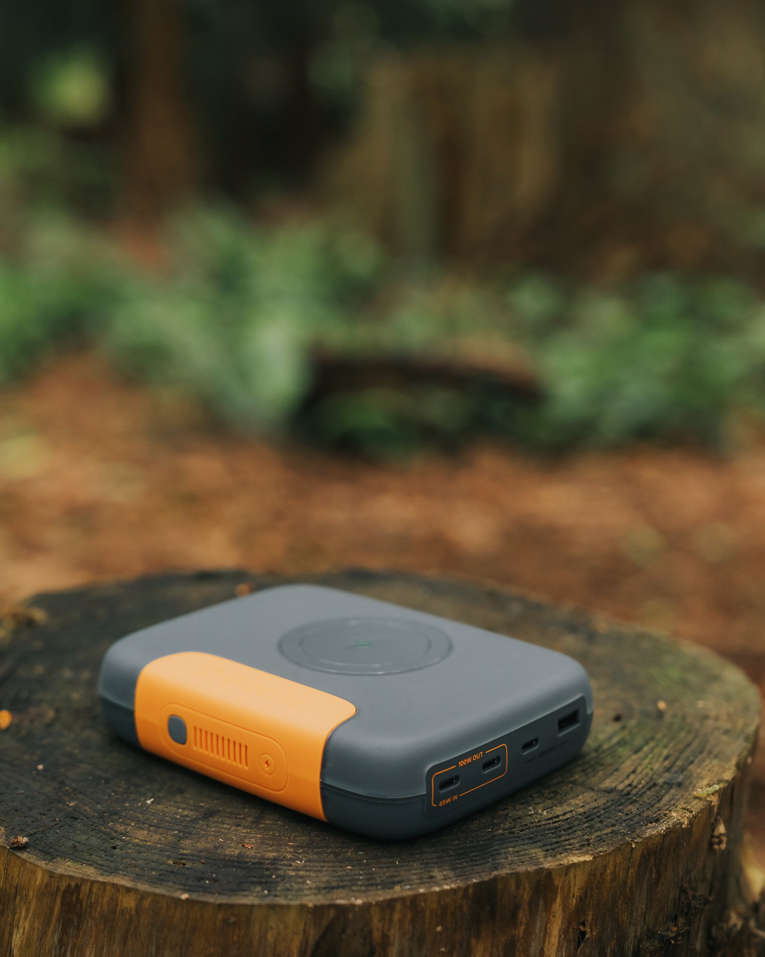 Wyposażony wyjście USB-A, dwa wyjścia USB-C oraz indukcyjną poduszkę daje możliwości ładowania urządzeń przez kabel lub indukcyjnie (magnetic wireless). Dzięki kilku wyjściom oraz poduszce indukcyjnej, można jednocześnie ładować klika urządzeń (przykładowo smartfona, laptopa i czołówkę).