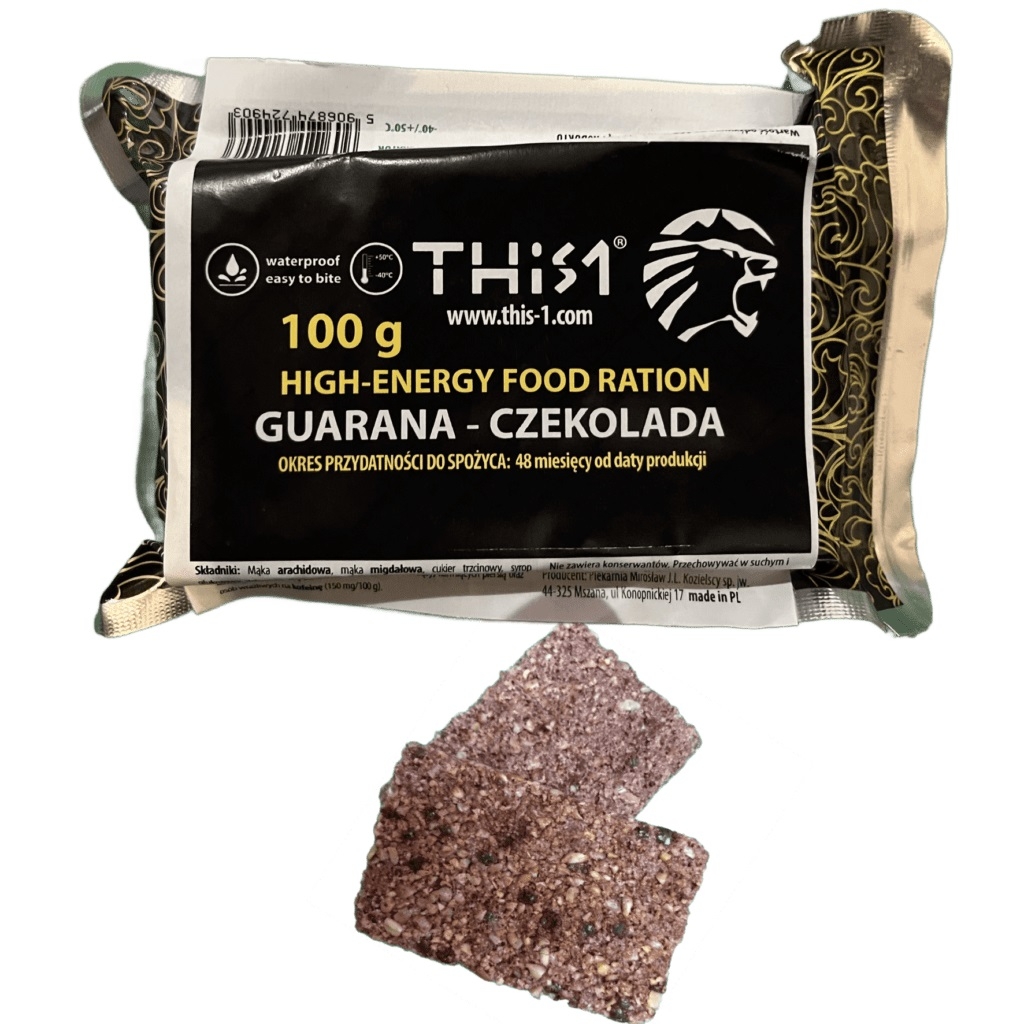 Baton Survivalowy Guarana–Czekolada zawiera naturalną Guaranę, w której znajduje się 150 g Kofeiny. UWAGA, Zalecane użycie to nie więcej niż 3 batony dziennie. W specjalnych sytuacjach (akcje ratownicze, zagrożenie życia) można używać batony z guaraną jako główne źródło energii i utrzymania organizmu na chodzie, w minimalnych odstępach co 2 do 2,5 godziny, nie dłużej niż 24 godziny.