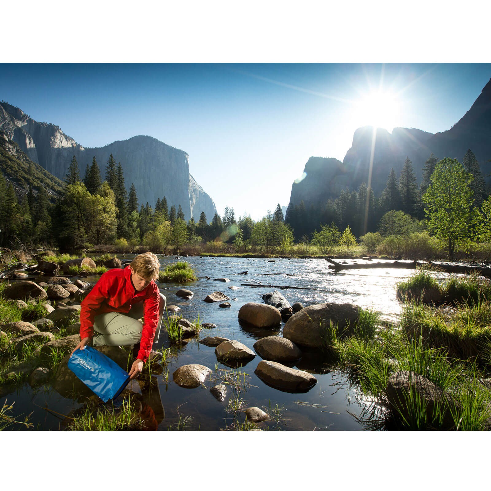 Grawitacyjny filtr do wody. Dla większej grupy osób, ekspedycji lub po prostu - dla domu. Pojemność 5 lub 12 litrów. Filtr nie wymaga użycia prądu ani części zamiennych. Nie trzeba także pompować wody. Wystarczy napełnić wodą worek, zamknąć rolowane zamknięcie i po prostu powiesić. Pod wpływem grawitacji woda będzie spływała przez filtr do podstawionego naczynia. Dzięki temu można mieć szybko i bez wysiłku pięć albo nawet dwanaście litrów czystej wody.