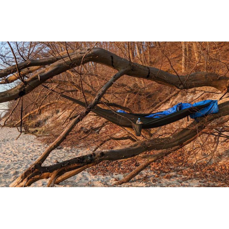 Gdzie przechowywać latarkę czy inne podręczne przedmioty w nocy skoro nie da się pod głową? Nie ma problemu, pokrowiec na Svinge to też zintegrowana kieszonka, przytwierdzona na stałe do hamaka, w połowie długości. Spokojnie pomieści latarkę, telefon i butelkę na wodę, na nocne suchoty.