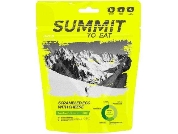 Liofilizowana jajecznica z serem. Danie wegetariańskie i bezglutenowe. Wartość kaloryczna: 454 kcal. Waga: 87 gramów. Czas przygotowania posiłku: niecałe 10 minut.