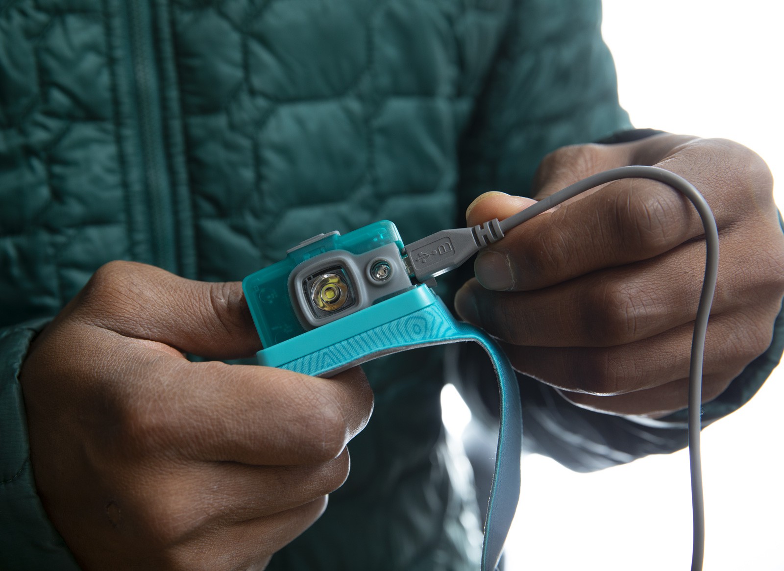 Lampkę czołową ładuje się przez port micro-USB. Maksymalny czas świecenia wynosi do 40 godzin, a w trybie najsilniejszym – do 3 godzin. Wskaźnik rozładowania baterii (dioda w kolorze zielonym / pomarańczowym / czerwonym) pokazuje, kiedy czołówkę należy naładować. Produkt spełnia międzynarodową normę IPX4, co oznacza, że jest odporny na zachlapania i deszcz (strumień wody o wydajności do 10 litrów na minutę).