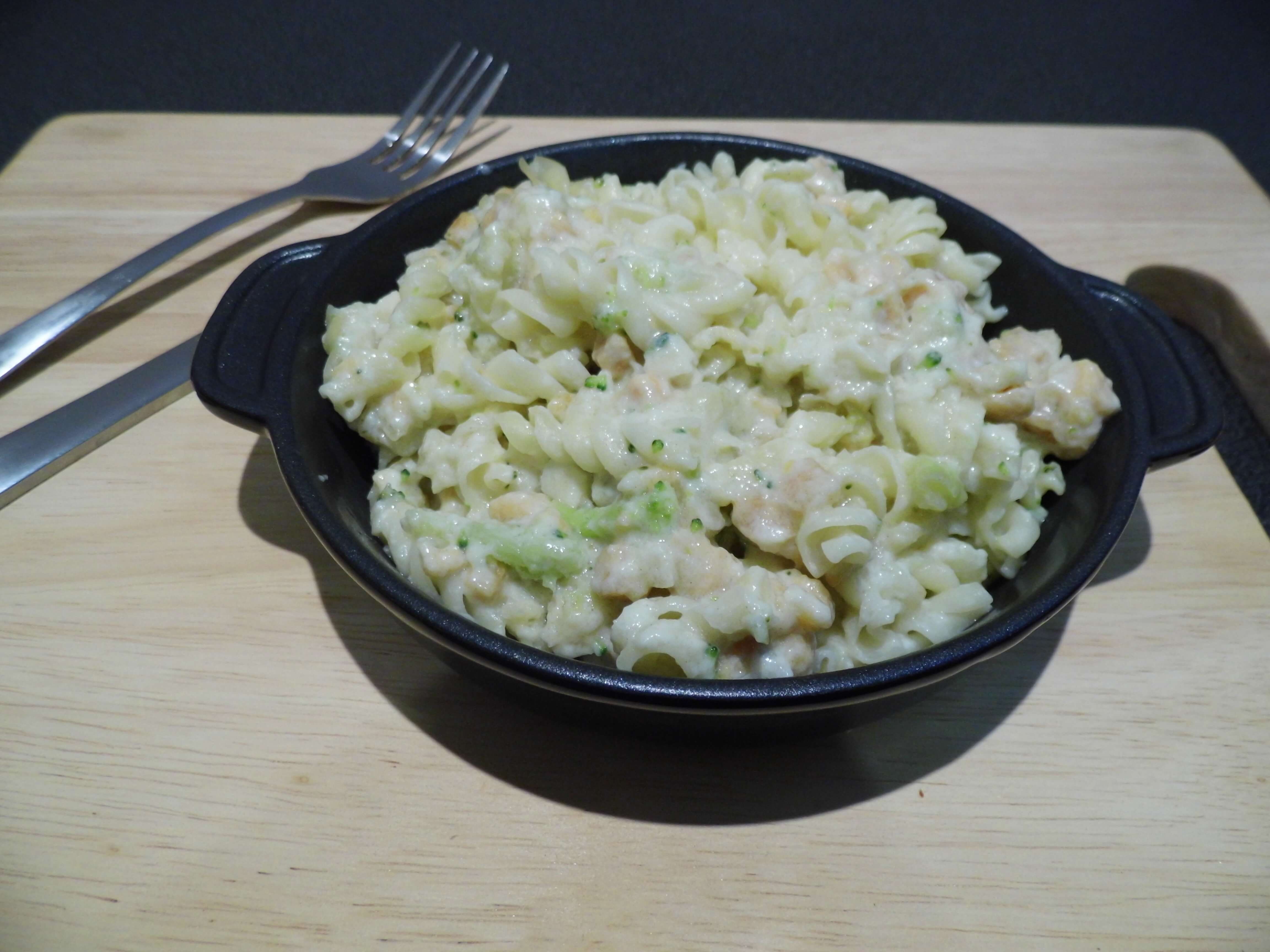 Skład: pełne mleko (21%), makaron pszenny (30%), krojony łosoś (10%), śmietanka, cebula, różyczki brokuła (7.5%), olej rzepakowy, mąka kukurydziana, sól, biały pieprz. Alergeny: mleko, pszenica, ryba.