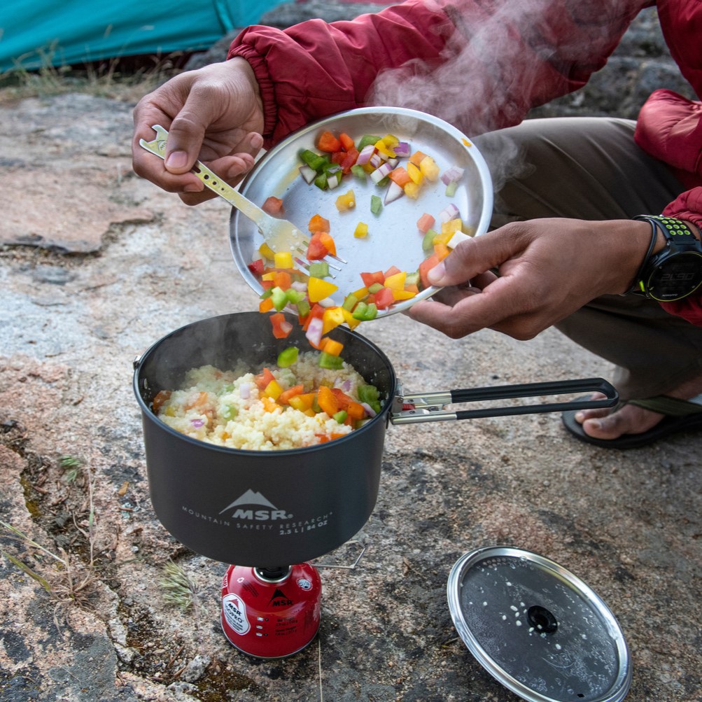 - W skład zestawu wchodzi naczynie do gotowania o pojemności 1.2 l z przylegającą ściśle pokrywką, składana kuchenka PocketRocket Deluxe oraz praktyczny i niewielki chwytak;