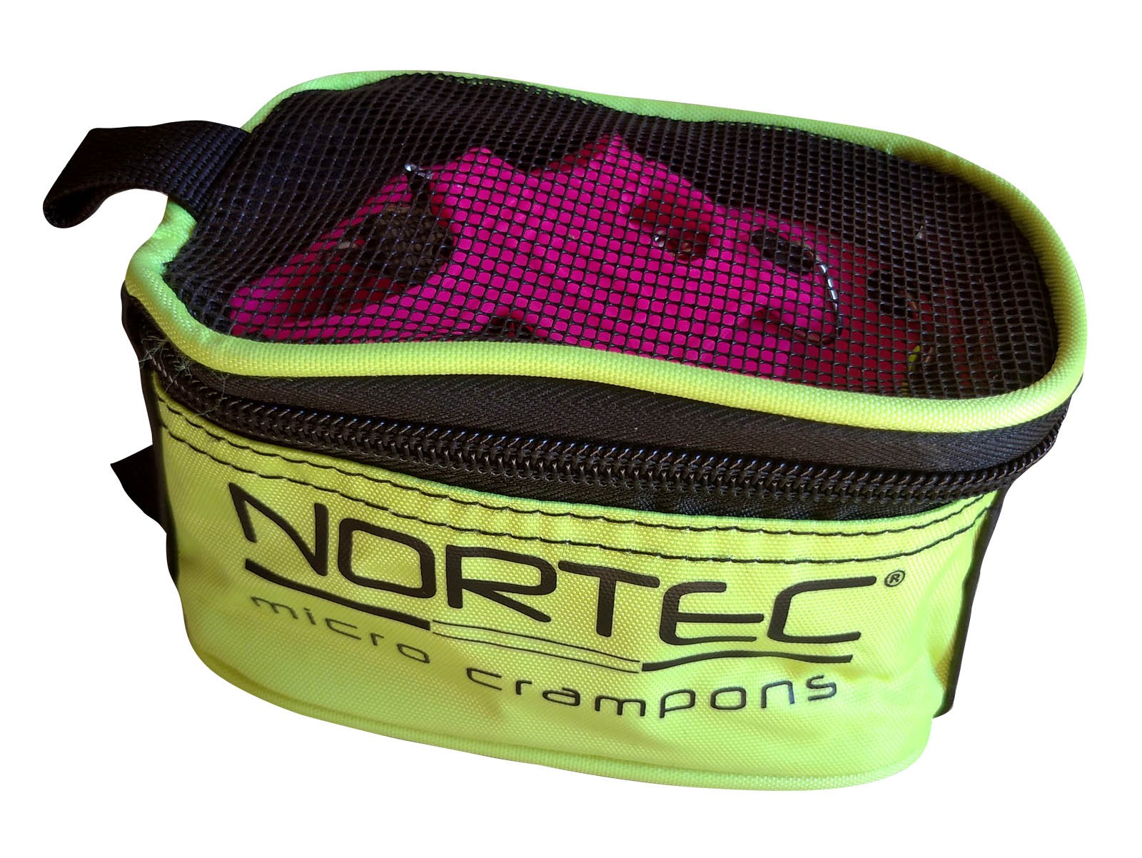 Nakładki zimowe na buty Nortec Fast wykonane są z silikonowego elastomeru o wysokiej wytrzymałości, który jest odporny na ekstremalnie niskie temperatury (aż do -60°C!) oraz nierdzewnej stali. Mają dwadzieścia jeden kolców z wytrzymałej stali nierdzewnej, umocowanych stalowym, nierdzewnym łańcuszkiem do silikonowej obejmy, które pomagają lepiej utrzymywać równowagę na śniegu, lodzie, błocie czy mokrych liściach. Łańcuszek łączy silikonowy stabilizator z dwiema płytkami, na których umieszczone są zęby raczków. Przednia płytka jest ruchoma i dzięki temu oczyszcza się z lodu i śniegu. Dzięki swojej solidnej i specjalnej budowie doskonale trzymają się obuwia biegowego, zapewniając optymalną stabilność kroków. Nakładki bardzo łatwo naciąga się na buty. Pakowane są w zapinany na suwak pokrowiec z uchwytem. Pokrowiec wykonany jest częściowo z siatki, co ułatwia obsychanie raczków po spakowaniu. Niewielkie rozmiary po złożeniu sprawiają, że zajmują niewiele miejsca w torbie czy w plecaku.