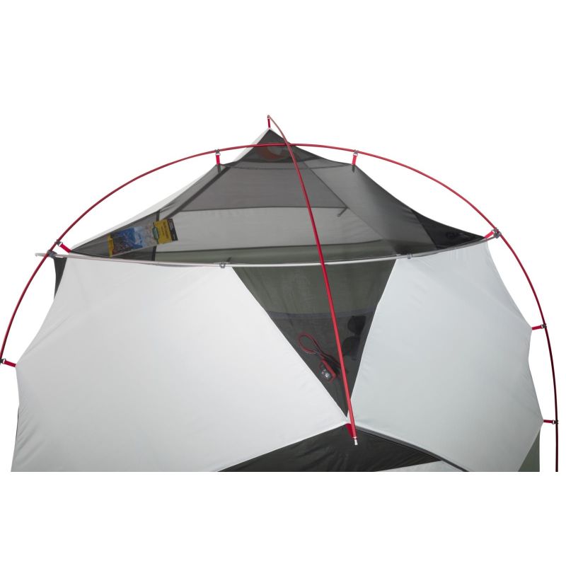 Wnętrze: Wnętrze jest przestronne i ma powierzchnię 3,79 m², dzięki czemu możesz swobodnie się rozciągnąć na biwaku. Bez problemu pomieści nowoczesne, szerokie materace turystyczne, bez nakładania się, dzięki prawdziwie prostokątnej podłodze. Korpus namiotu to mieszanka siatki i pełnego materiału, co zapewnia idealną równowagę między oddychalnością a prywatnością. Drzwi namiotu pozbawione krzywizn są wyposażone w zamki błyskawiczne, które łatwo obsługiwać jedną ręką. Zamki zamykają się również do jednego punktu, dzięki czemu zawsze wiesz, gdzie otworzyć drzwi, nawet w ciemności. Kieszenie z portami kablowymi w narożnikach są przyjazne dla technologii – idealne na słuchawki i przewody do ładowania. Duże kieszenie na sprzęt nad głową (gear loft) są idealne na czołówki, okulary przeciwsłoneczne i inne przedmioty wymagające szybkiego dostępu.