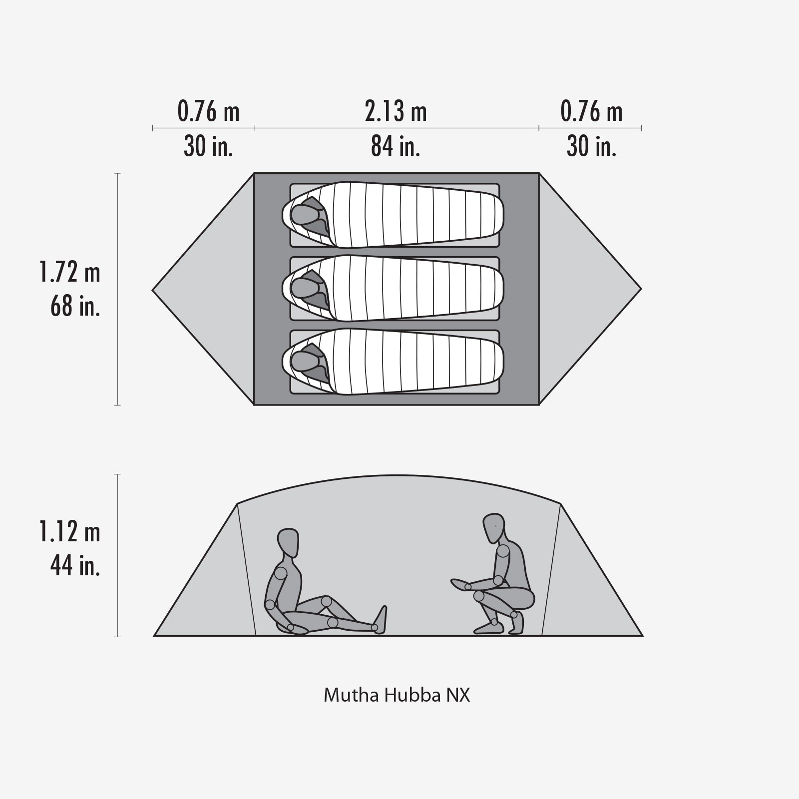 Trzyosobowy namiot Mutha Hubba NX, posiada wyjątkowo ergonomiczne wnętrze oraz dwa jeszcze większe przedsionki pozwalające pomieścić dużą ilość ekwipunku nadal pozostawiając dużo przestrzeni do mieszkania. Sypialnia z siatki. Przy dobrej pogodzie można używać samej sypialni.