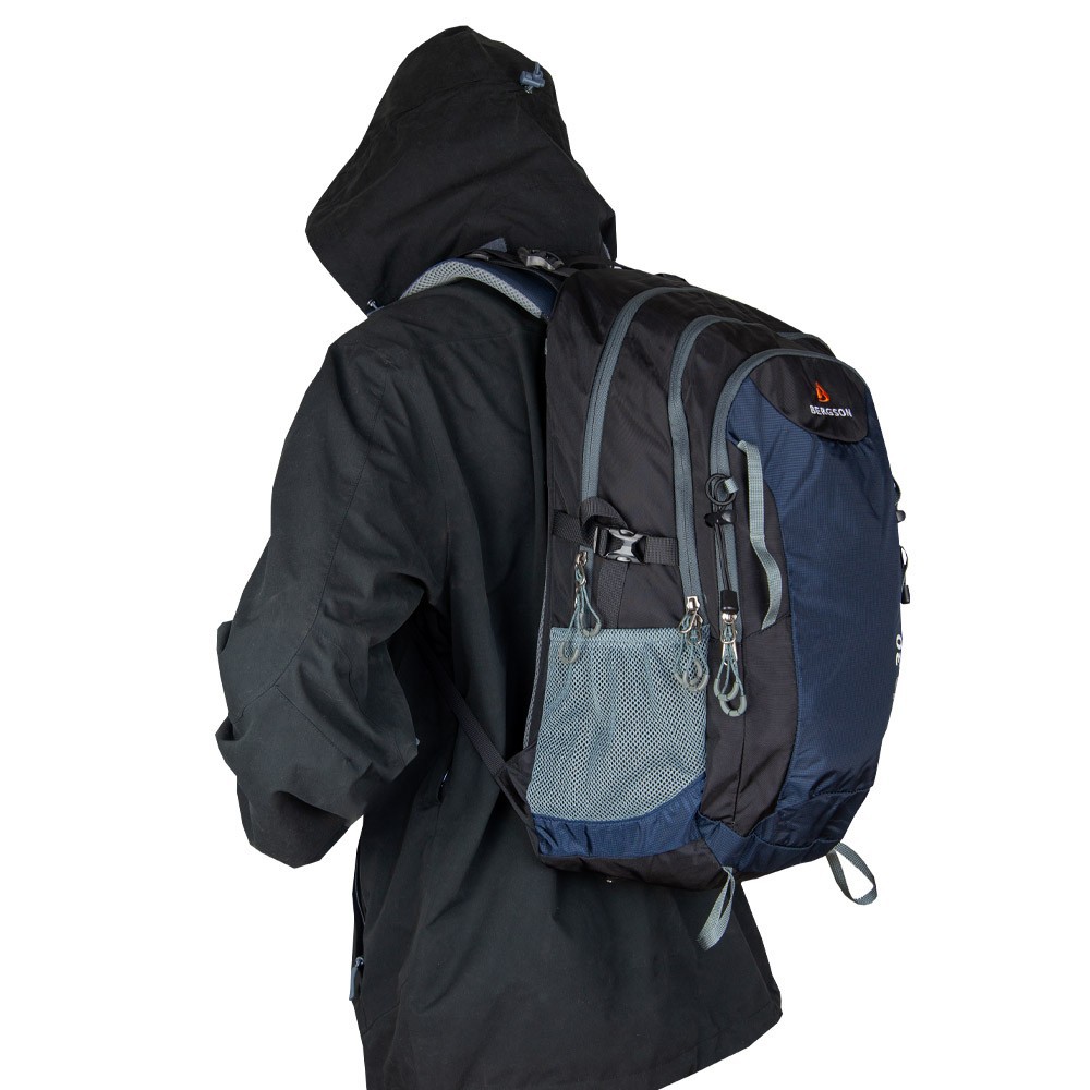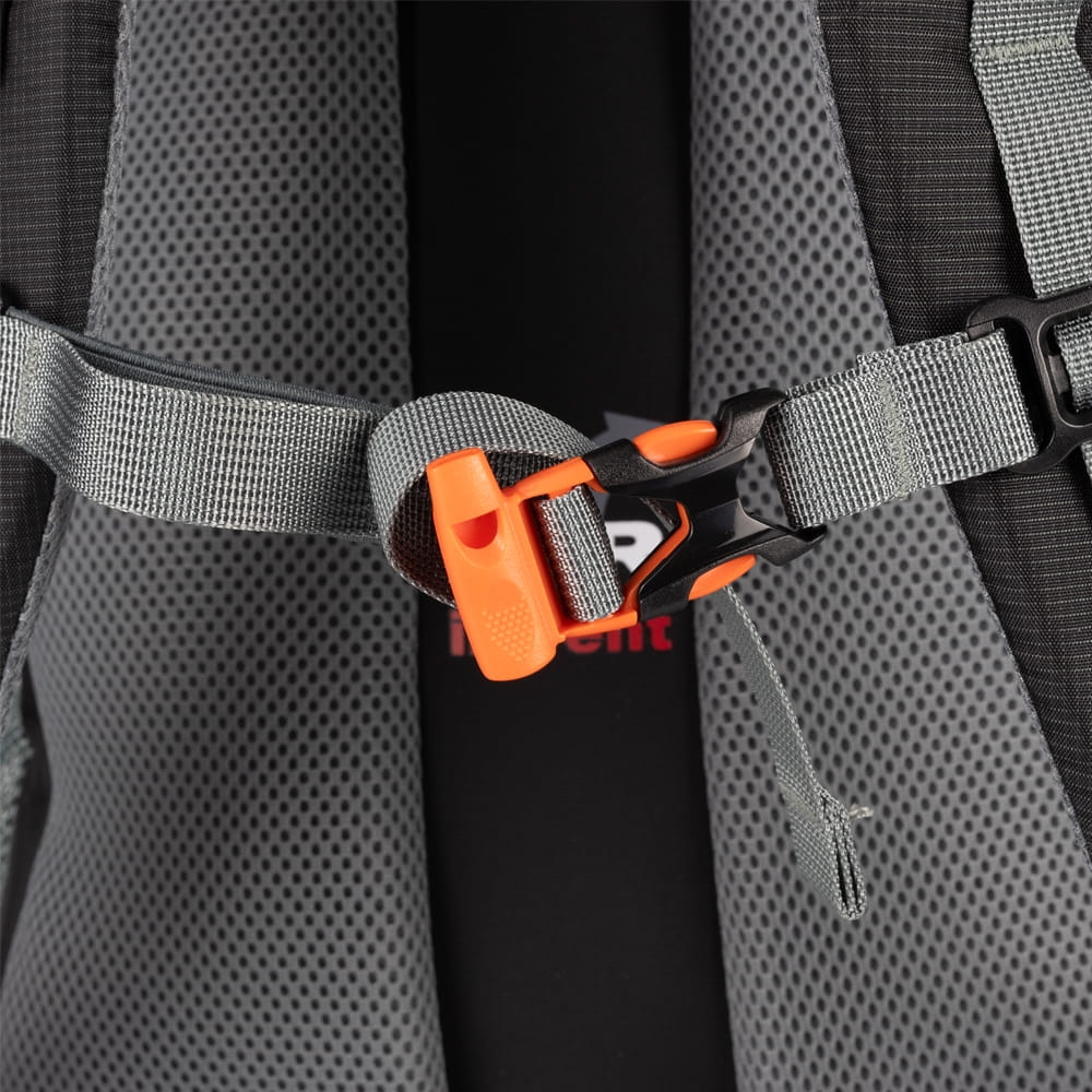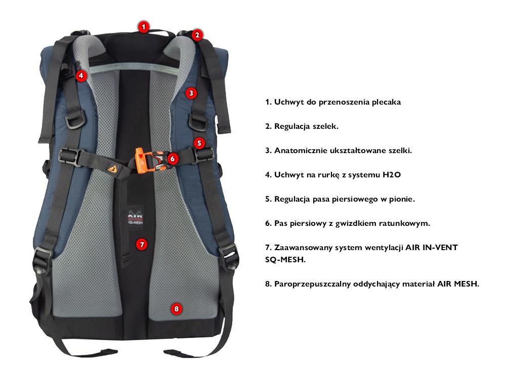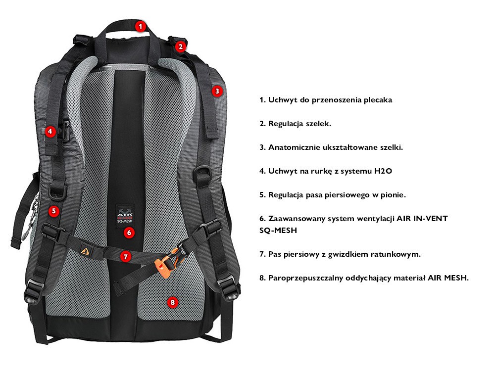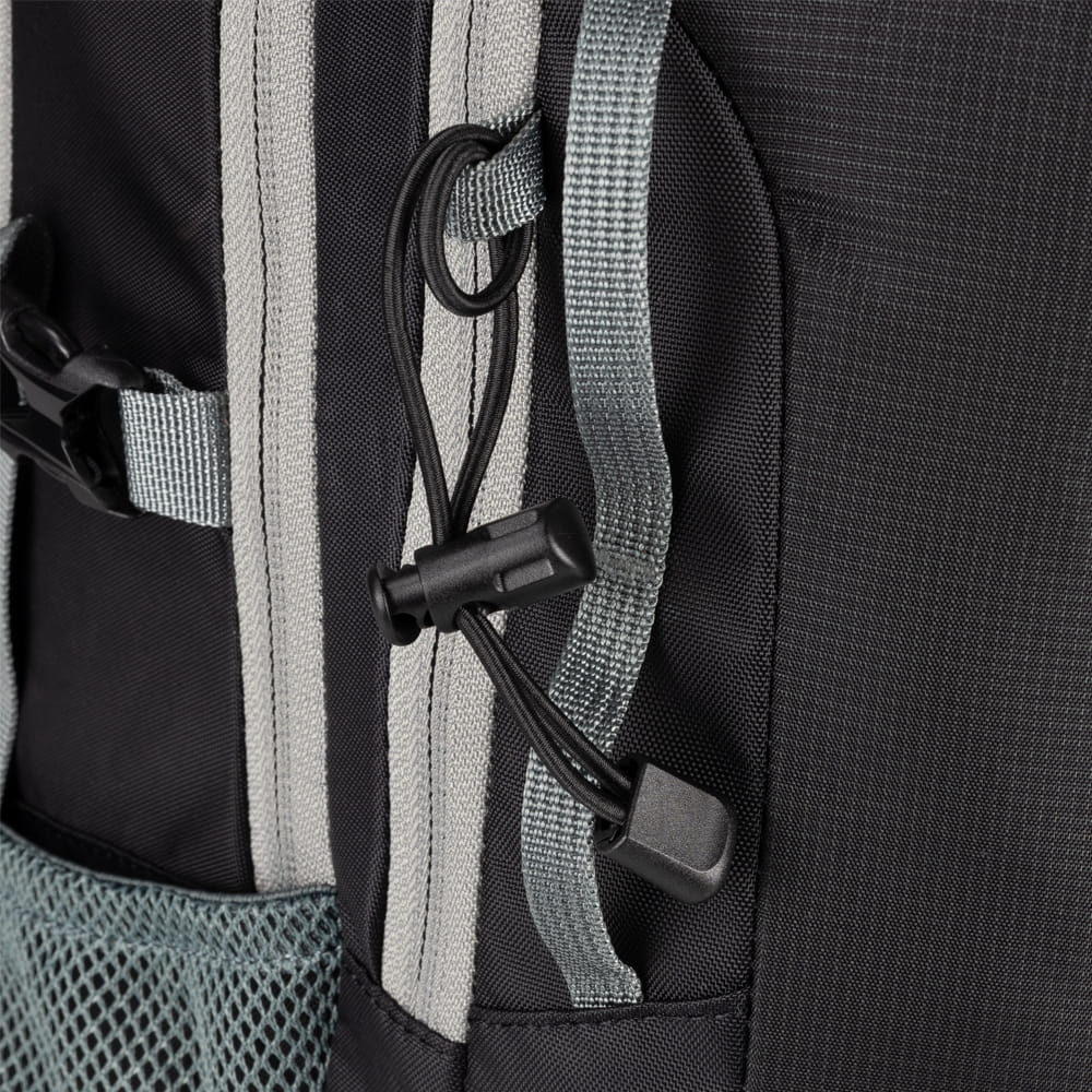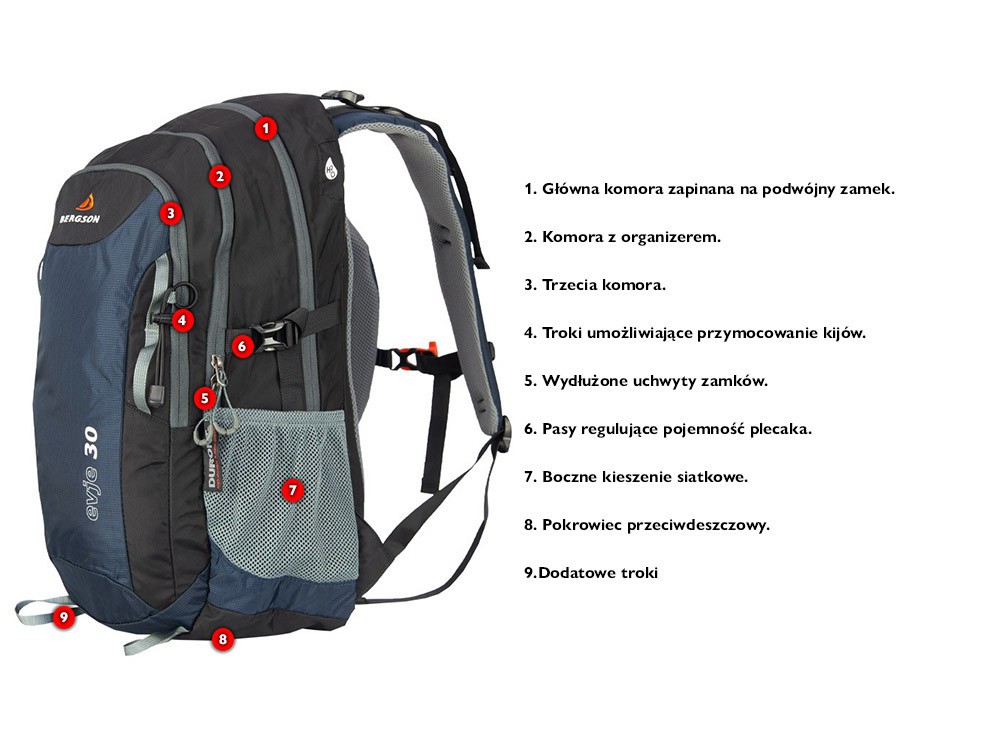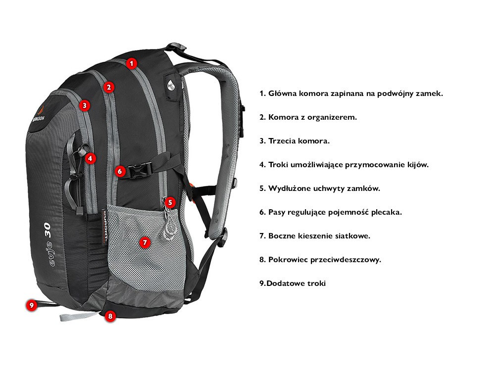 Plecak turystyczno-miejski, z dwiema komorami zapinanymi na suwak. Boczne kieszenie z siatki pomieszczą butelkę z wodą lub podręczne drobiazgi. Plecak wyposażony jest w pokrowiec przeciwdeszczowy schowany w spodzie plecaka. Uchwyt do przenoszenia. Plecak ma możliwość przypięcia kijków trekkingowych lub dwóch czekanów.