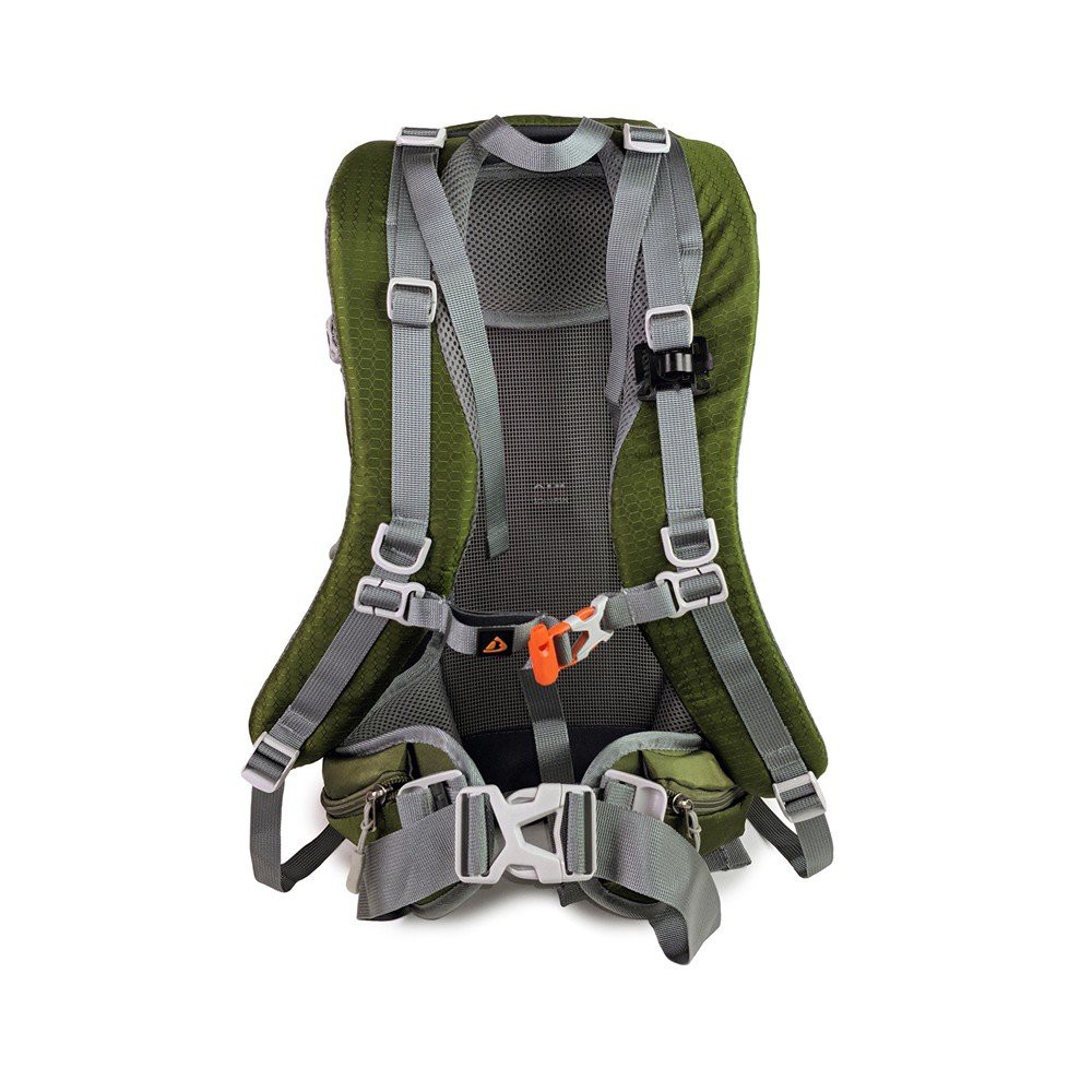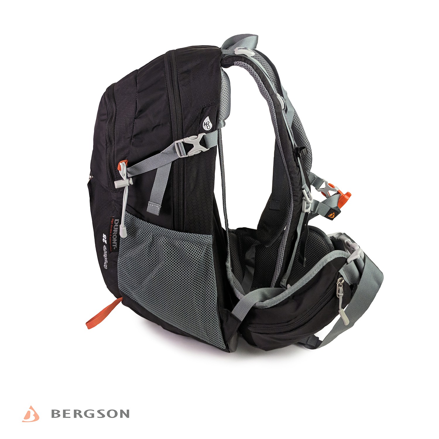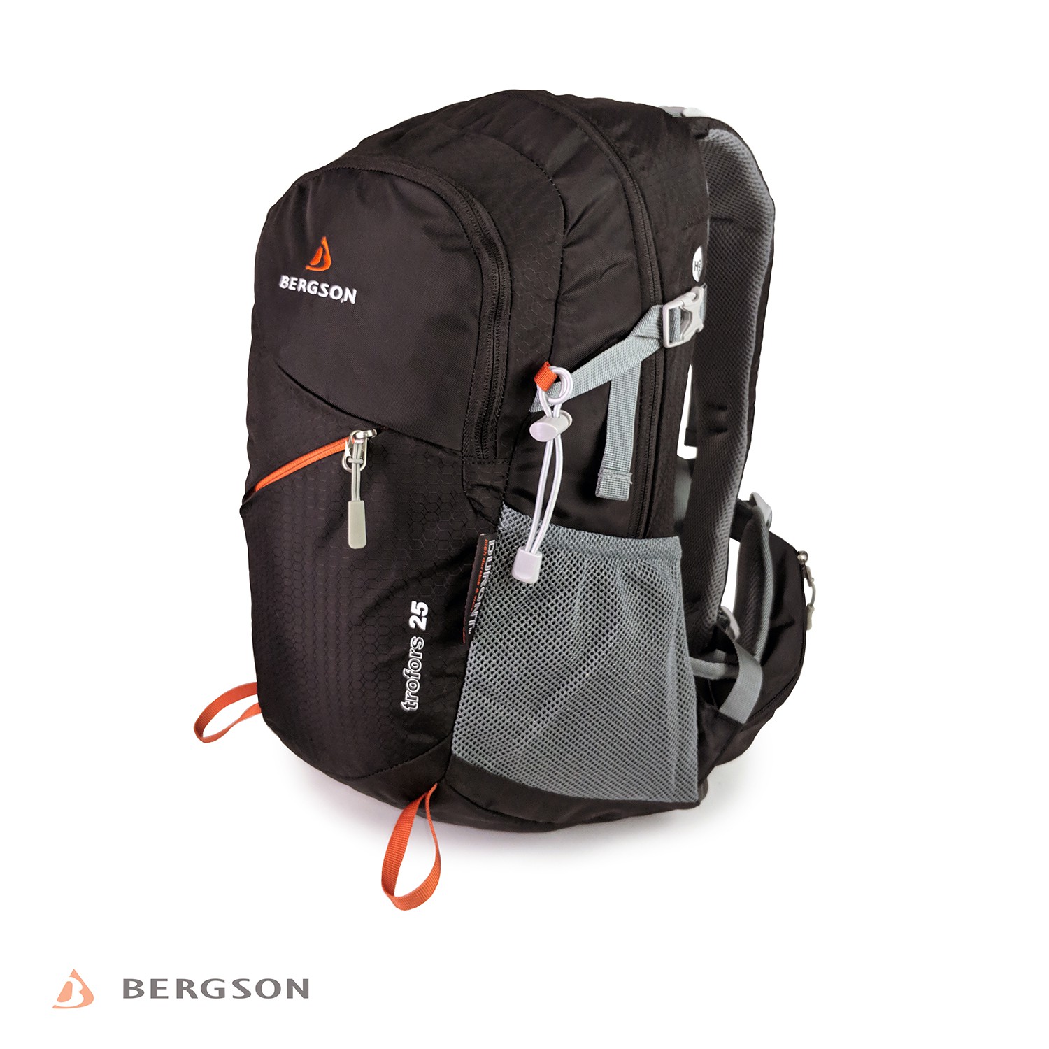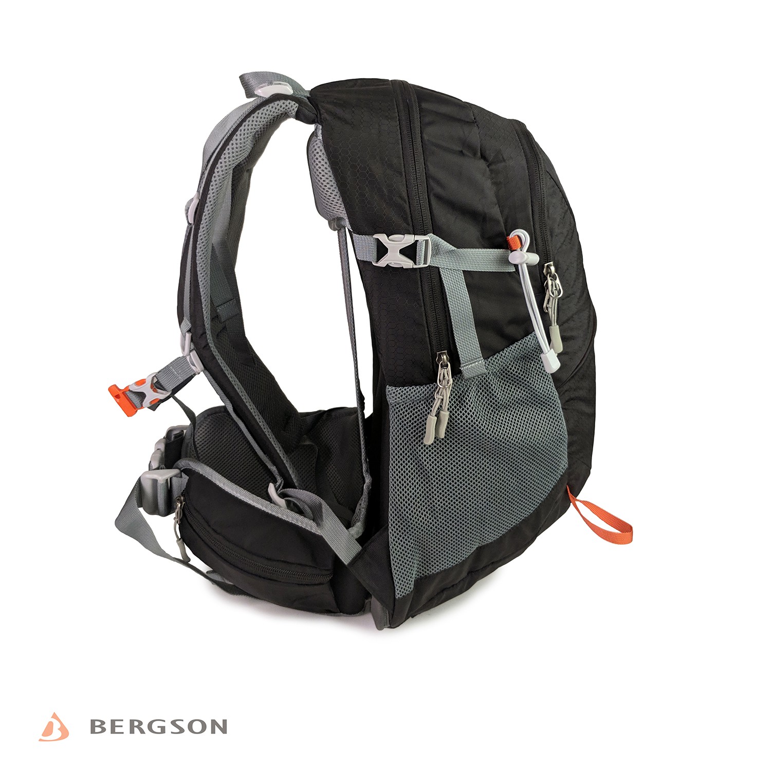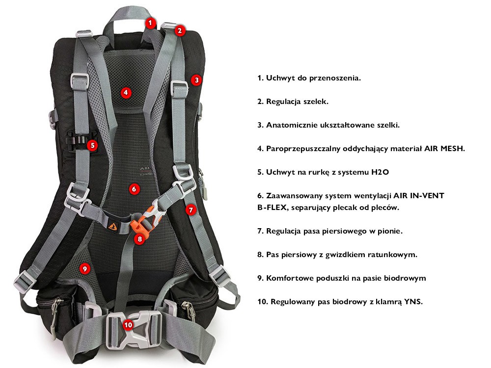 Solidny, wytrzymały plecak wycieczkowy. Wyposażony w rozwiązania z dużych plecaków turystycznych - pas biodrowy i piersiowy, kieszenie, zaczepy oraz pokrowiec przeciwdeszczowy schowany w kieszeni na dole plecaka. Posiada dwie komory. Dużą główną komorę zapinaną na suwak z system H2O przystosowanym do montażu wewnątrz plecaka bukłaka z rurką, oraz mniejszą komorę z kiszonkami wewnątrz. Dodatkowo posiada dwie kieszenie na wierzchu plecaka na drobiazgi, zapinane na suwak. Pas biodrowy jest gruby i solidny, wyposażony w dwie zapinane na suwak kieszonki. Pasy ramieniowe są wyściełane i wyprofilowane, przystosowane do noszenia cięższych ładunków. Plecy plecaka to bardzo dobrze oddychająca siatka, izolująca plecak od pleców. Dodatkowe boczne kieszenie z siatki posłużą jako miejsce na butelkę z wodą lub chusteczki. Plecak ma możliwość przypięcia kijków trekkingowych lub dwóch czekanów.