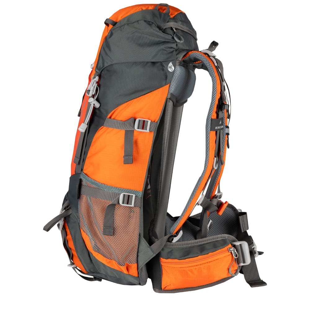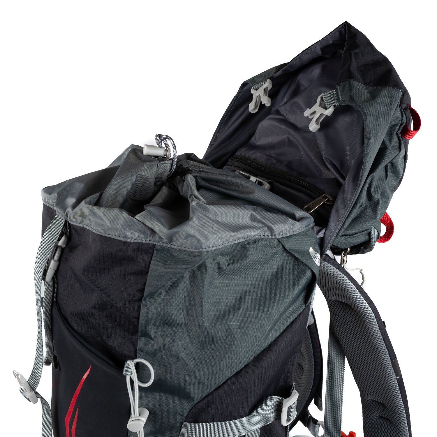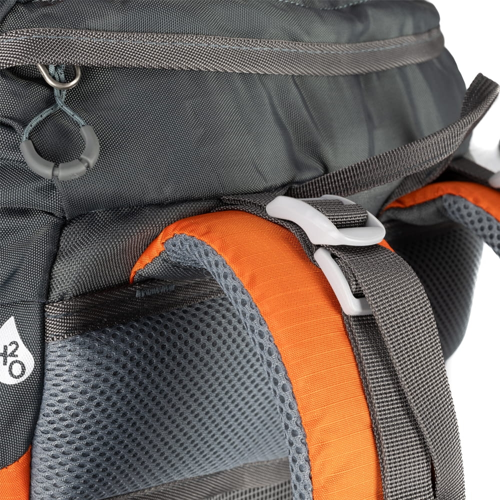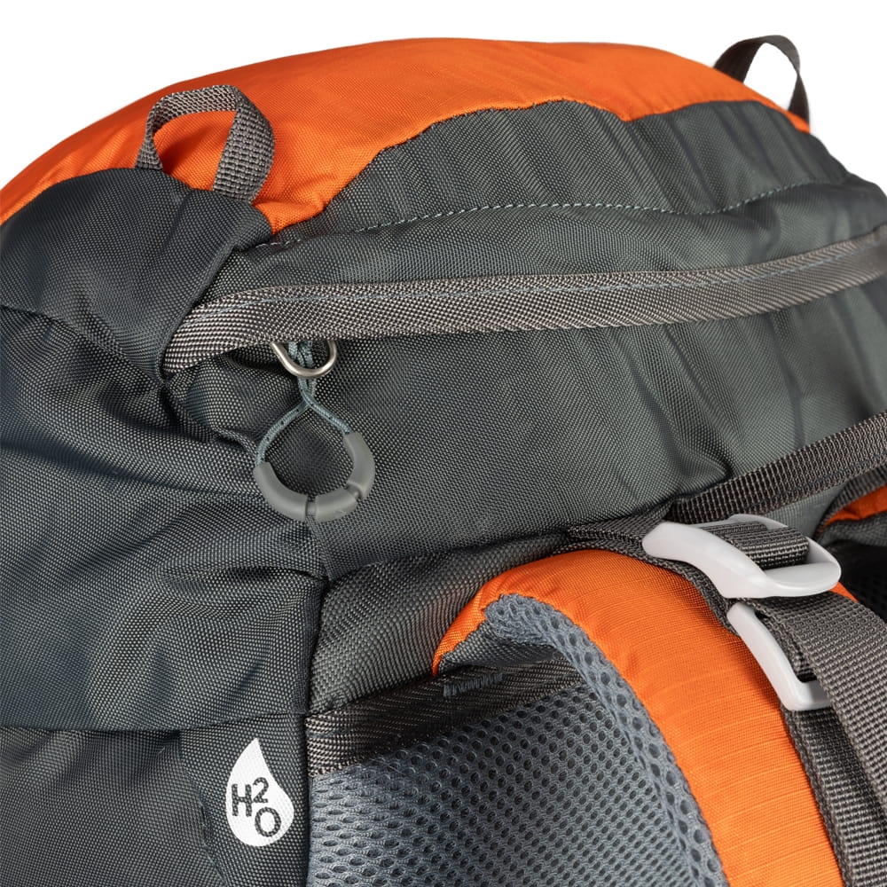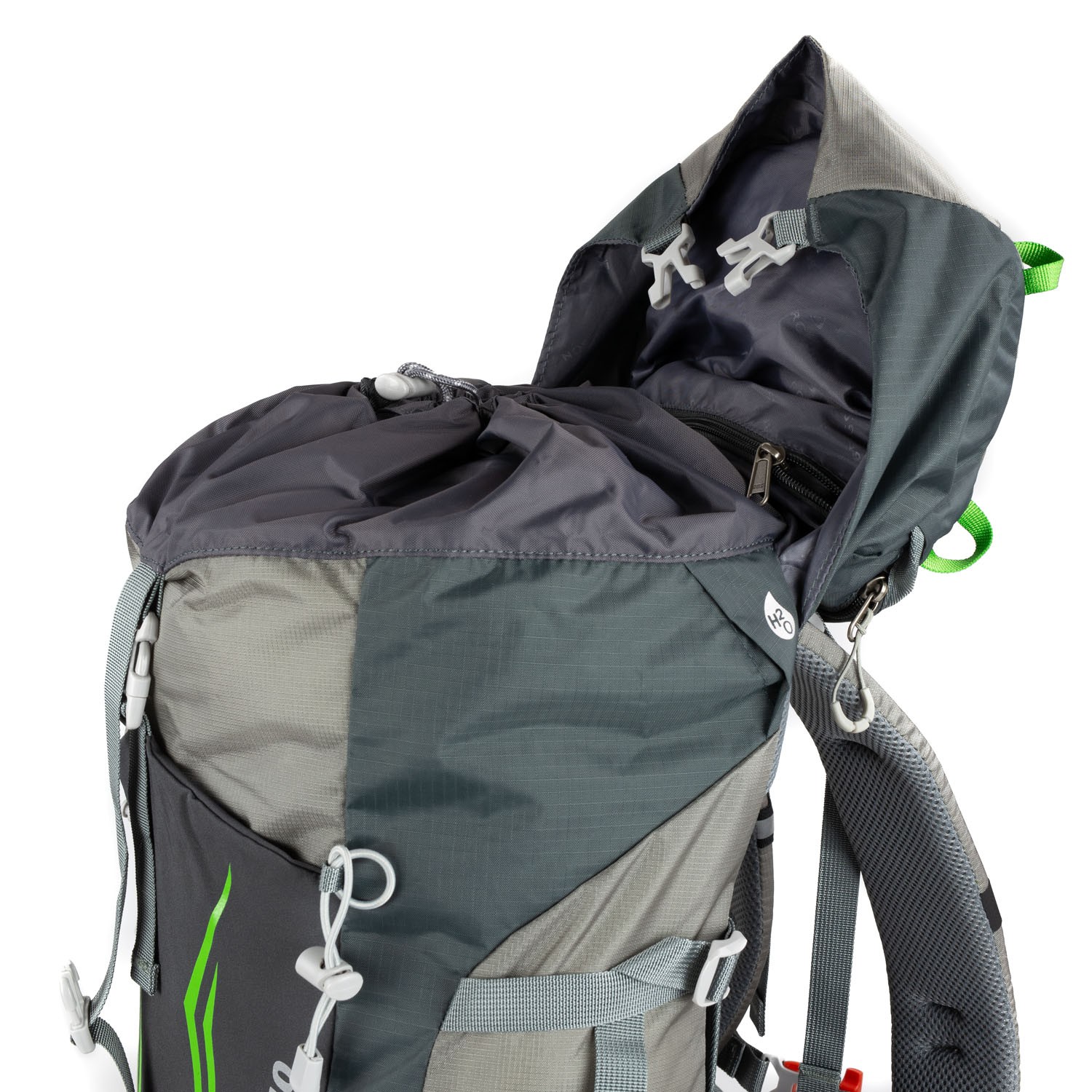 Plecak turystyczny z klapą. Solidny i miękki pas biodrowy z kieszonkami oraz pas piersiowy a także wyprofilowane szelki wygodnie dopasowują plecak do pleców i ułatwiają noszenie cięższego bagażu. Plecak posiada dwie kieszenie, kieszeń w klapie oraz kieszeń w na wierzchu. Boczne kieszenie z siatki pomieszczą butelkę z wodą lub podręczne drobiazgi. Plecak wyposażony jest w pokrowiec przeciwdeszczowy. Uchwyt do przenoszenia. Plecak ma możliwość przypięcia kijków trekkingowych lub dwóch czekanów. Wyposażony w elementy odblaskowe zwiększające bezpieczeństwo. Plecy plecaka to konstrukcja izolująca i odsuwająca plecy plecaka od pleców, co skutkuje znakomitą wentylacją.