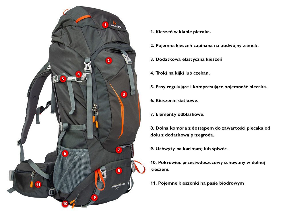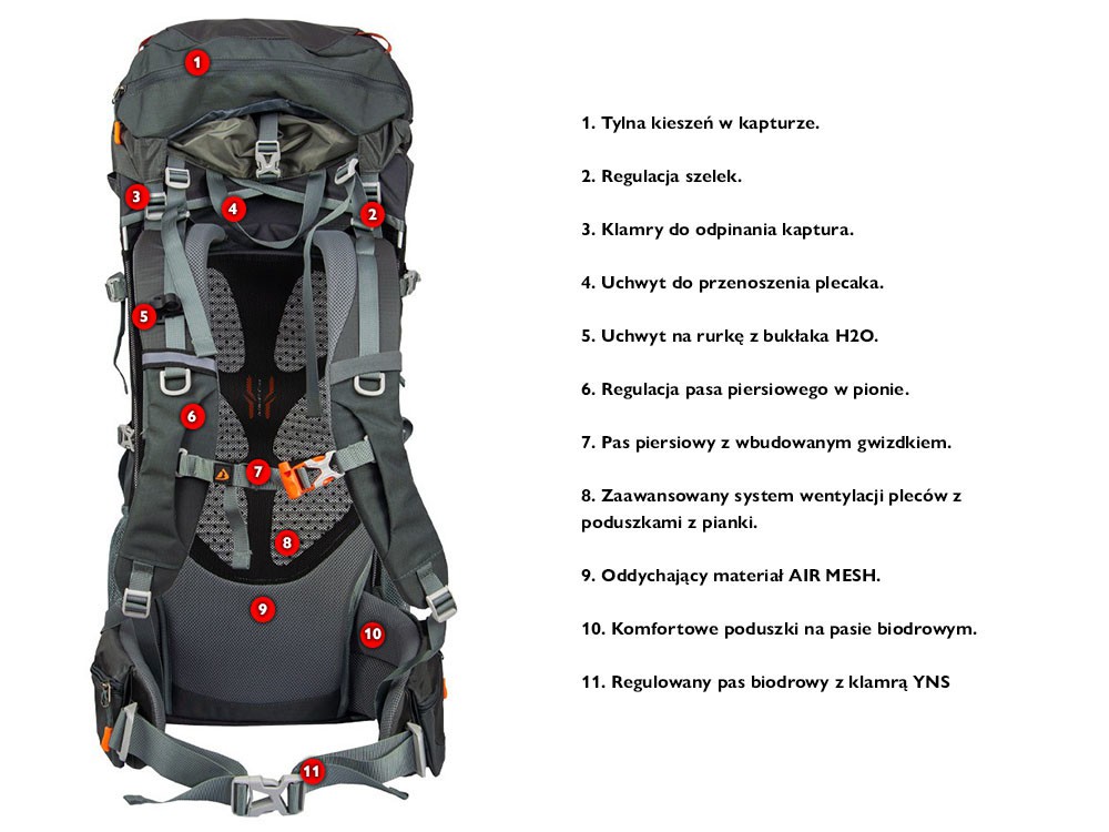 Plecak turystyczny o dużej pojemności. Solidny i miękki regulowany pas biodrowy z małymi kieszonkami oraz pas piersiowy a także wyprofilowane szelki wygodnie dopasowują plecak do pleców i ułatwiają noszenie nawet najcięższego bagażu.