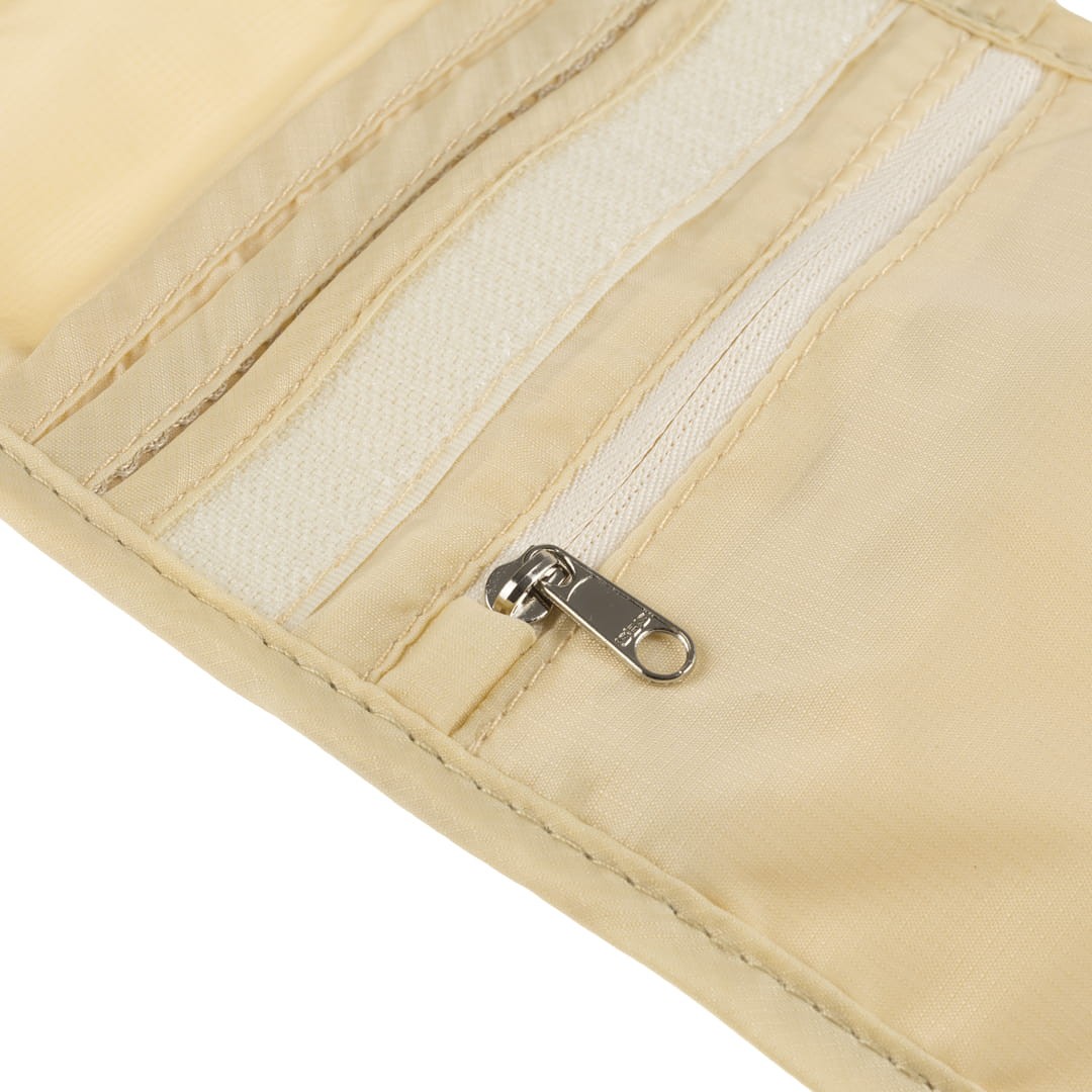 Podróżna saszetka do zawieszenia na szyi. Pomieści wszystkie przydatne w podróży dokumenty i waluty. Zamykana na rzep. Wyposażona w trzy płaskie kieszonki. Dodatkowa kieszonka zamykana na zamek. Z tyłu pokryta miłym i miękkim materiałem, co pozwala ją nosić nawet bezpośrednio na skórze. Cielisty kolor sprawia, ze nie widać jej pod nawet jasnym ubraniem.