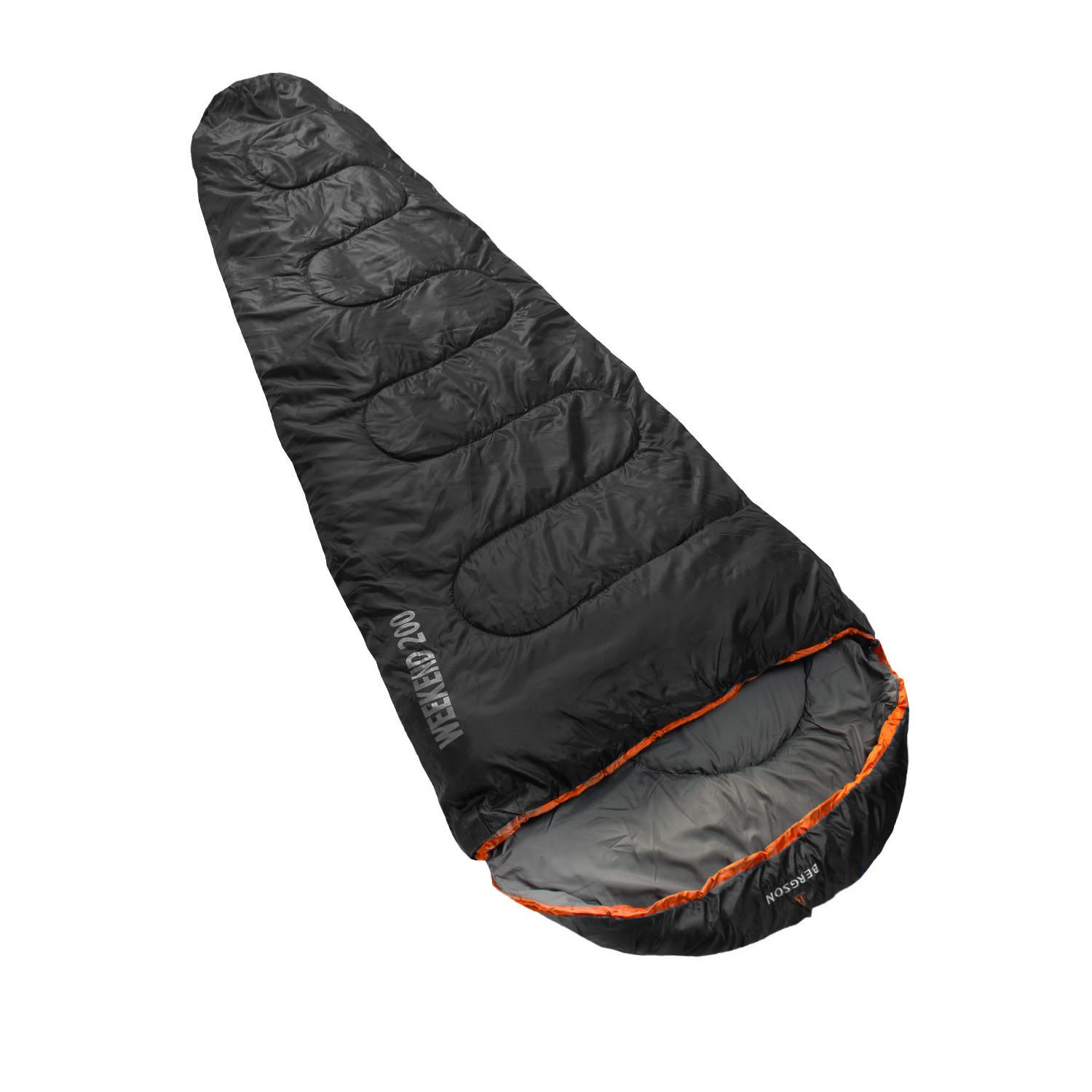Letni śpiwór w kształcie mumii z wypełnieniem syntetycznym.