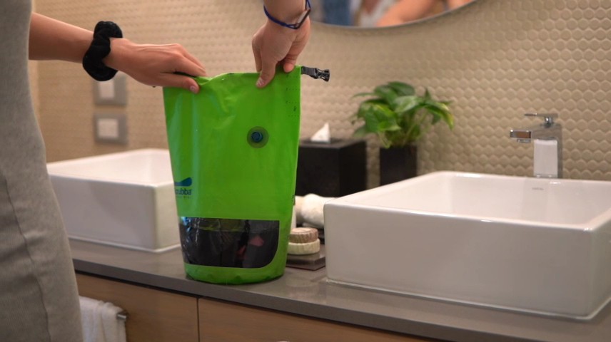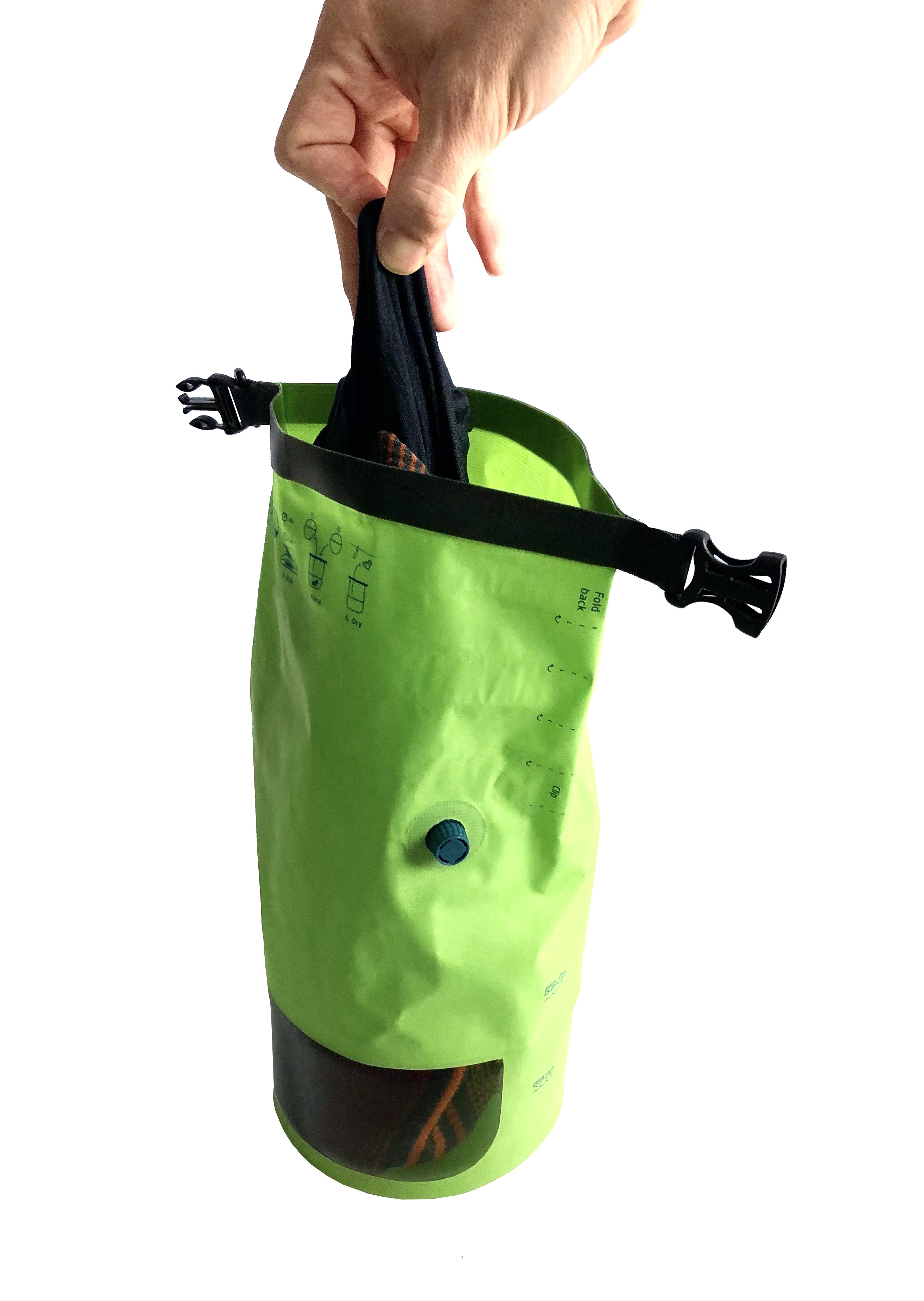 - Pranie w worku jest ekologiczne, ponieważ pozwala oszczędzać wodę i prać ubrania bez zanieczyszczania wody w potoku lub jeziorze. Żeby skutecznie wyprać odzież, wystarczy nalać do worka odpowiednią ilość wody (do zaznaczonego punktu), dodać proszek lub płyn do prania i zamknąć worek, pozbywając się powietrza ze środka. Specjalny odpowietrznik znajdujący się na ściance worka usuwa resztę powietrza z worka. Pranie polega na pocieraniu zawartości worka o specjalne plastikowe wypustki umieszczone na wewnętrznej ściance, które służą za tarkę i doskonale usuwają brud z ubrań. Zewnętrzna powłoka jest antypoślizgowa, co zapobiega ślizganiu się po powierzchniach podczas mycia. Po zakończeniu prania należy wylać brudną wodę, wlać czystą i wypłukać odzież.